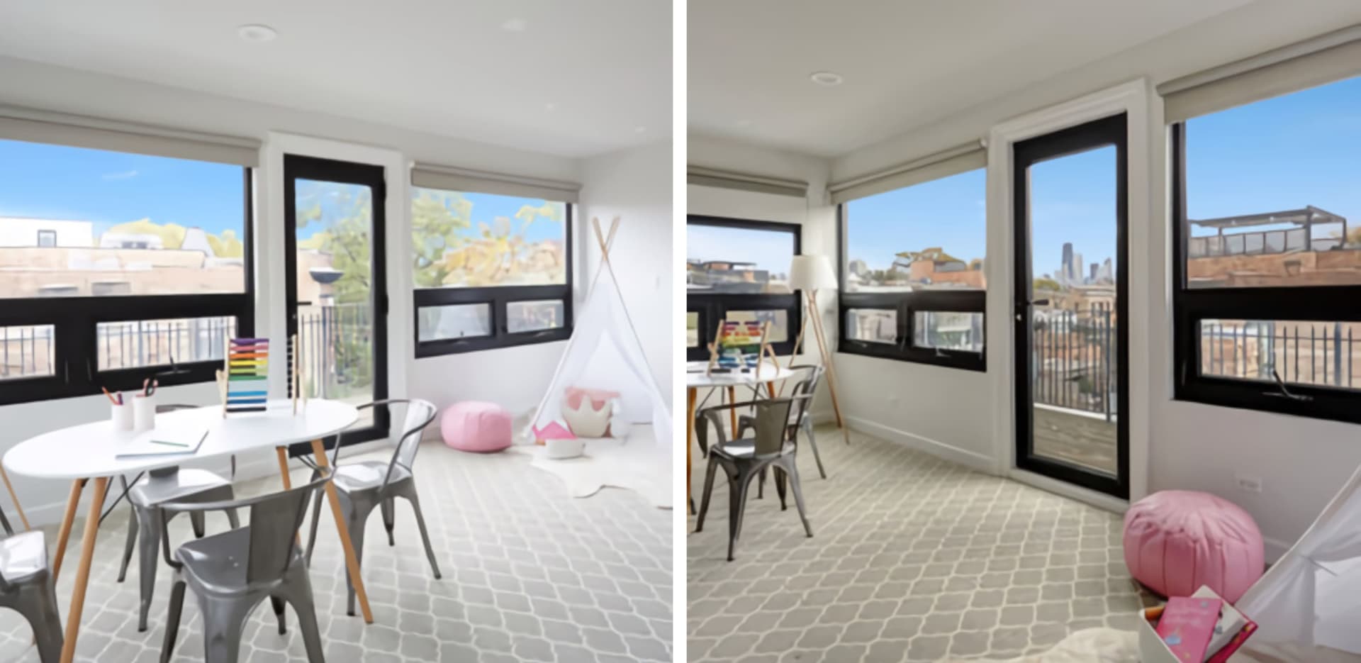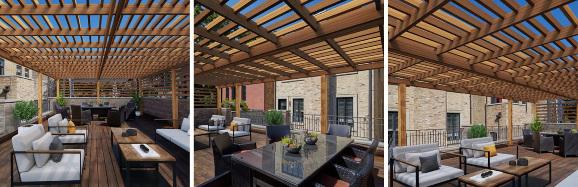 - Multiple outdoor spaces include a garage roof deck, a paver patio with a wood-burning fireplace & a balcony with panoramic views of the city.